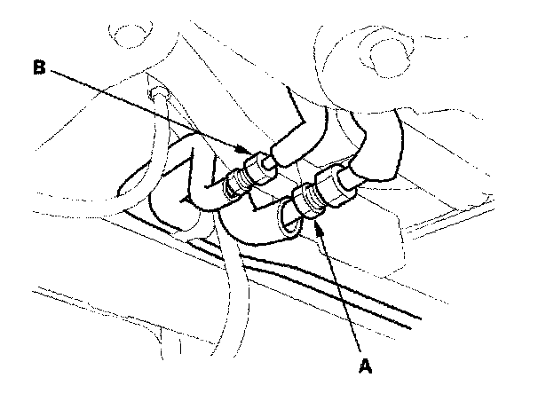 2. Disconnect the rear A/C suction line (A) and receiver line (B) at the front evaporator.