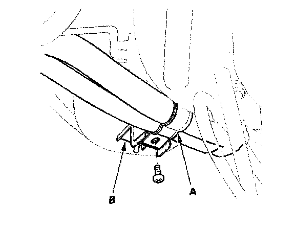 3. Install the A/C line clamp (A) on the lower replacement A/C line. Slide the bracket onto its A/C line bracket (B), but do not install the screw yet.