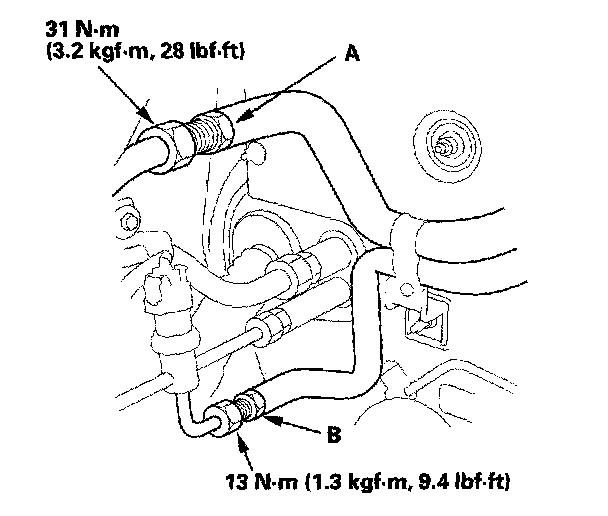 2. Route the upper replacement A/C lines along the engine compartment bulkhead, and loosely connect the upper lines (A) to the lower lines (B). Do not tighten the connections yet.