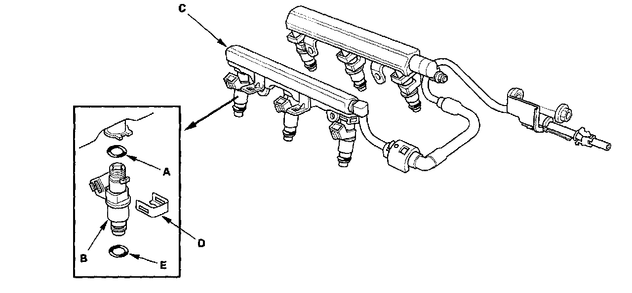 5. Remove the fuel rail mounting bolts (C)-from the fuel rail (D).