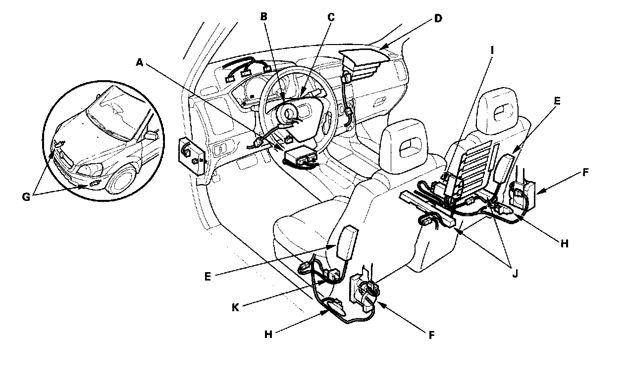 The SRS is a safety device which, when used with the seat belt, is designed to help protect the driver and front passenger in a frontal impact exceeding a certain set limit. The system consists of the SRS unit, including safing sensor and impact sensor (A), the cable reel (B), the driver's airbag (C), the front passenger's airbag (D), side airbags (E), seat belt tensioners (F), front impact sensors (G), side impact sensors (H). Since the driver's and front passenger's airbags use the same sensors, both normally inflate at the same time. However, it is possible for only one airbag to inflate. This can occur when the severity of a collision is at the margin, or threshold, that the SRS unit determines whether or not the airbags will deploy. In such cases, the seat belt will provide sufficient protection, and the supplemental protection offered by the airbag would be minimal.