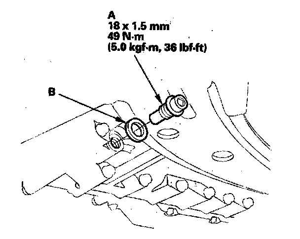 2. Remove the drain plug (A), and drain the automatic transmission fluid (ATF). Reinstall the drain plug with a new sealing washer (B).