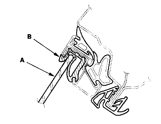 6. Raise the glass fully, and check for gaps. Check that the glass (A) contacts the glass run channel (B) evenly.