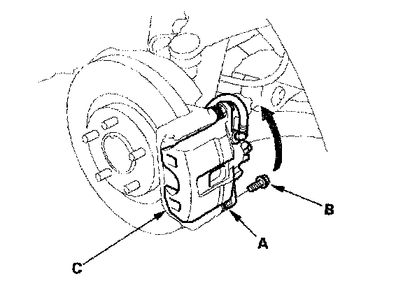 2. Hold the caliper pin (A) with a wrench, being careful not to damage the pin boot. Remove the caliper bolt (B) with another wrench, and pivot the caliper (C) up out of the way. Check the brake hose and pin boots for damage and deterioration.