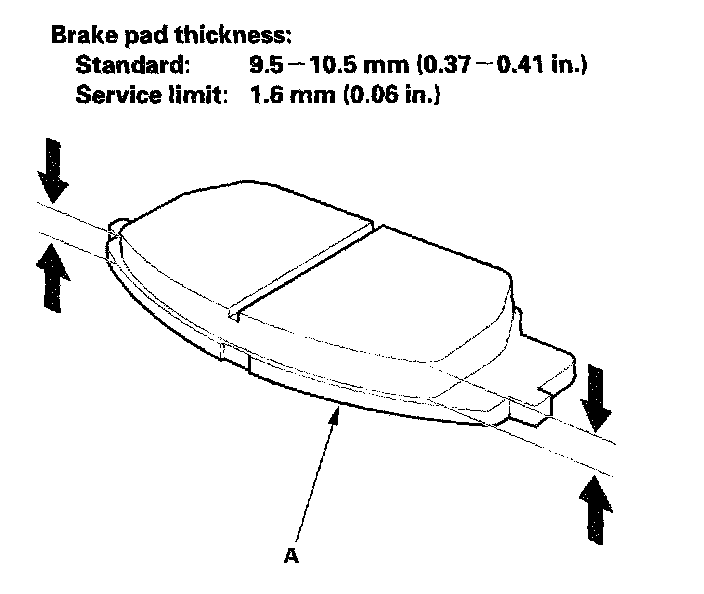 4. Using vernier calipers, measure the thickness of each brake pad lining. The measurement does not include the pad backing plate (A) thickness.