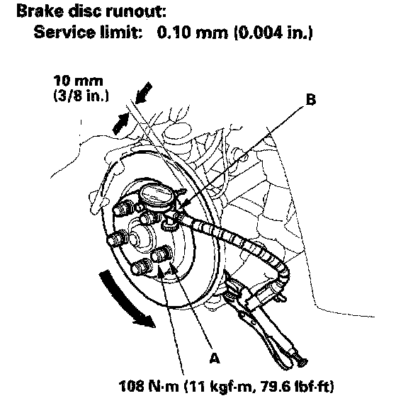 4. Use wheel nuts and suitable flat washers (A) to hold the disc securely against the hub, then mount a dial indicator (B) as shown, and measure the runout at 10 mm (3/8 inch) from the outer edge of the disc.