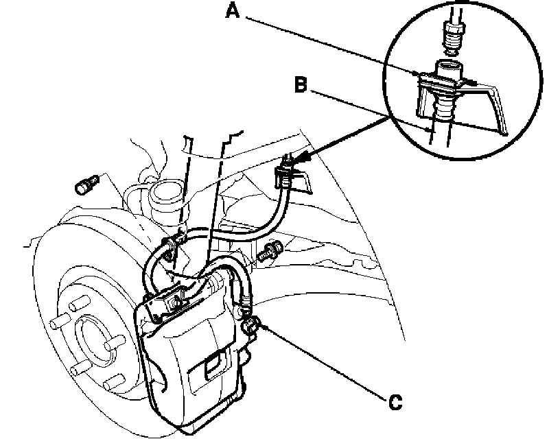 4. Remove the banjo bolt (C), and disconnect the brake hose from the caliper.