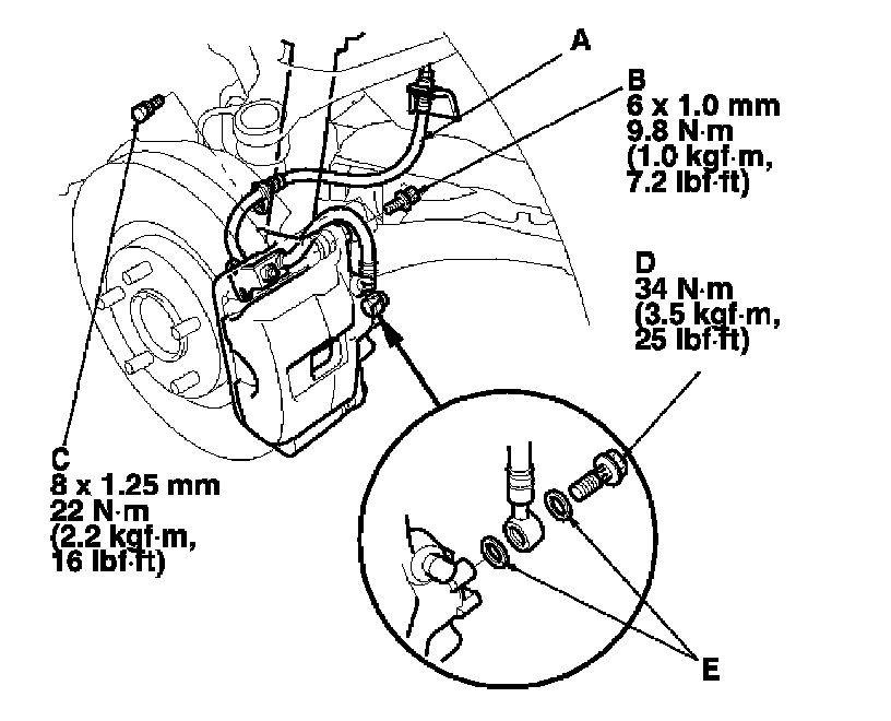 6. Install the brake hose (A) on the knuckle and damper bracket with two 6 mm flange bolts (B) and the 8 mm flange bolt (C) first, then connect the brake hose to the caliper with the banjo bolt (D) and new sealing washers (E).