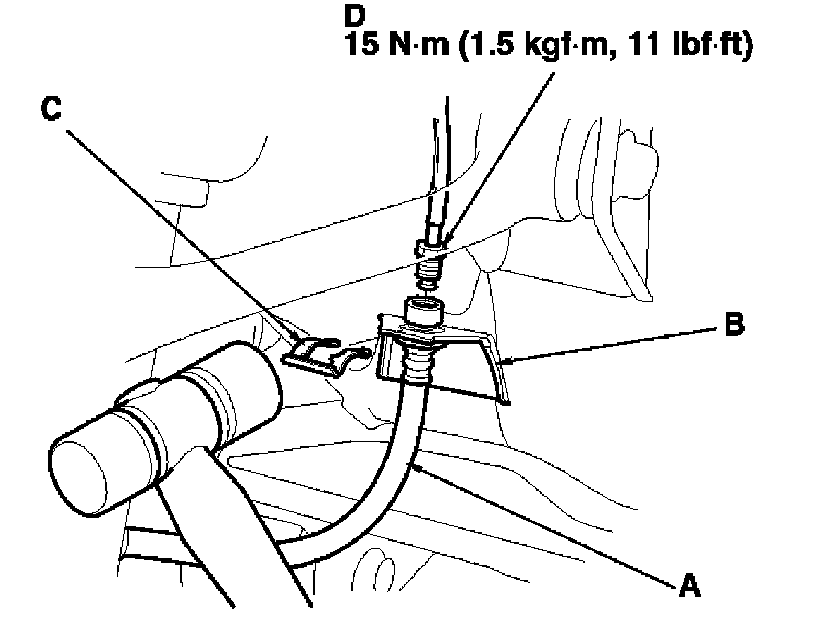 7. Install the brake hose (A) on the upper brake hose bracket (B) with a new brake hose clip (C).