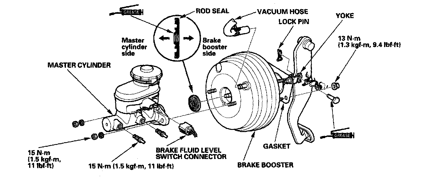 Master Cylinder/Brake Booster ReplacementNOTE: Do not spill brake fluid on the vehicle; it may damage the paint; If brake fluid does contact the paint, wash it off immediately with water.