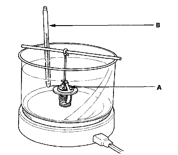 2. Heat the water and check the temperature with the thermometer. Check the temperature at which the thermostat first opens, and at which it is fully open.