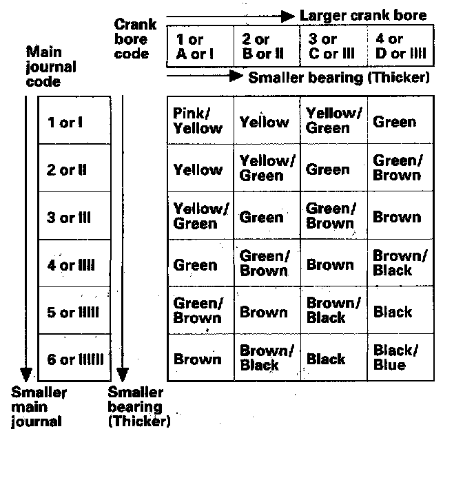 3. Use the crank bore codes and crank journal codes to select the appropriate replacement bearings from the following table.