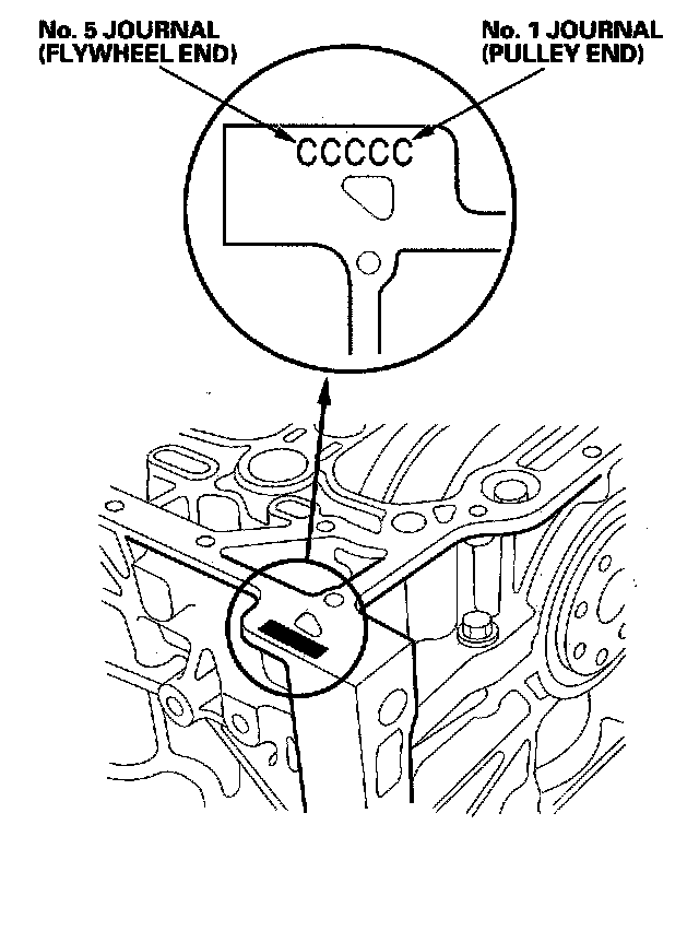 1. Numbers or letters or bars have been stamped on the end of the block as a code for the size of each of the five main journal bores. Write down the crank bore codes.