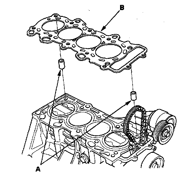 4. Install the dowel pins (A) and the new cylinder head gasket (B).