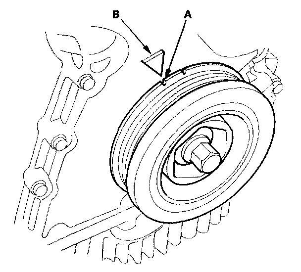 11. Make sure the crankshaft pulley is at Top Dead Center (TDC). Align the TDC mark (A) on the crankshaft pulley with the pointer (B) on the chain case.