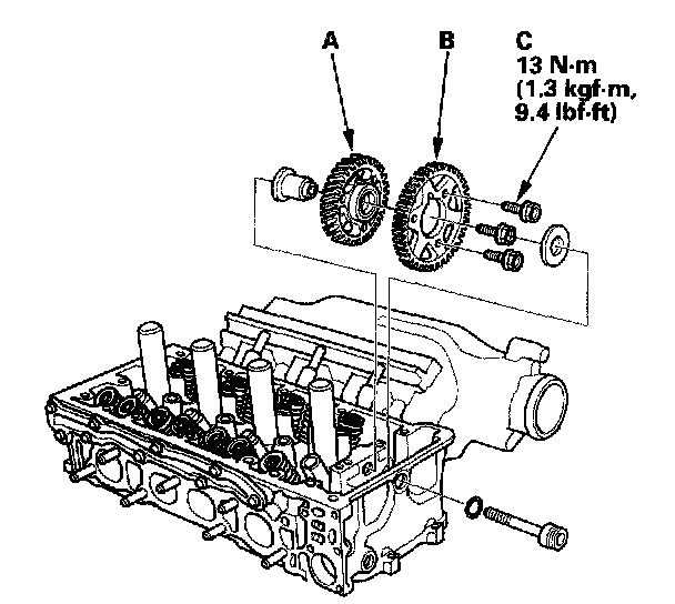 12. Assemble the idler gear (A) and cam chain sprocket (B) with three mounting bolts(C). Torque the bolts to 13 Nm (1.3 kgf-m, 9.4 ft. lbs.).
