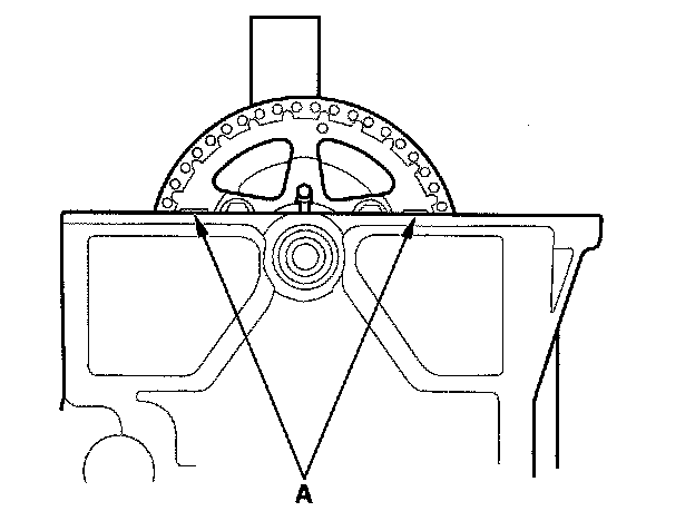 15. Turn the idler gear counterclockwise to relieve cam chain free play, and check the alignment of the TDC marks (A) on the cam chain sprocket with the cylinder head surface. If the cam chain sprocket is not positioned at TDC, remove the idler gear from the cylinder head and reposition the cam chain to bring the cam chain sprocket to TDC.