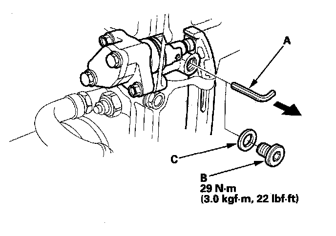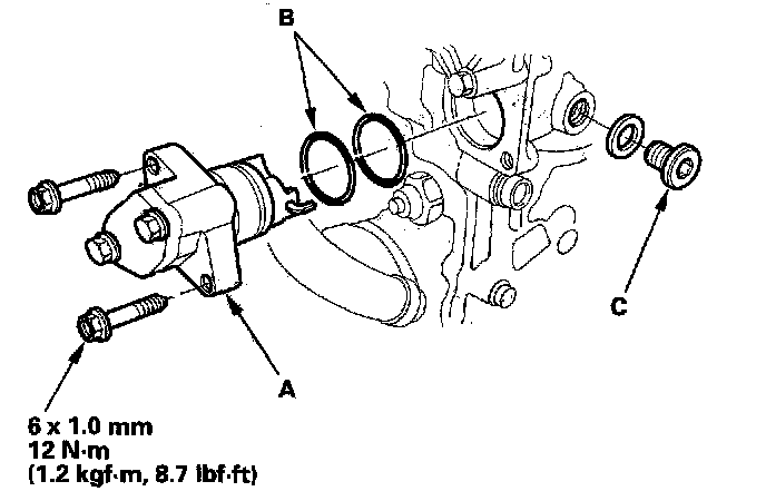 23. Remove the set pin (A) from the cam chain autotensioner. Reinstall the maintenance bolt (B) with a new washer (C).
