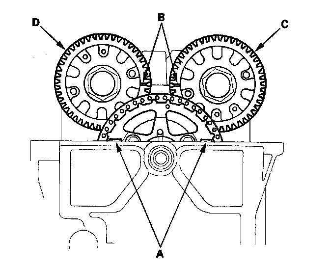 25. Align the TDC marks (B) on the intake camshaft gear (C) and the exhaust camshaft gear (D), and install the camshafts.