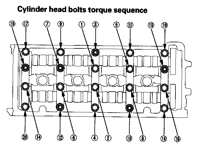 8. Tighten the cylinder head bolts in sequence to 29 Nm (3.0 kgf-m, 22 ft. lbs.) Use a beam-type torque wrench. When using a preset-type torque wrench, be sure to tighten slowly and do not overtighten. If a bolt makes any noise while you are torquing it, loosen the bolt and retighten it.