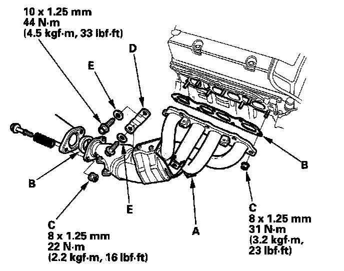 32. Install the exhaust manifold bracket (D). Make sure the smooth sides of the washers (E) face the exhaust manifold bracket.