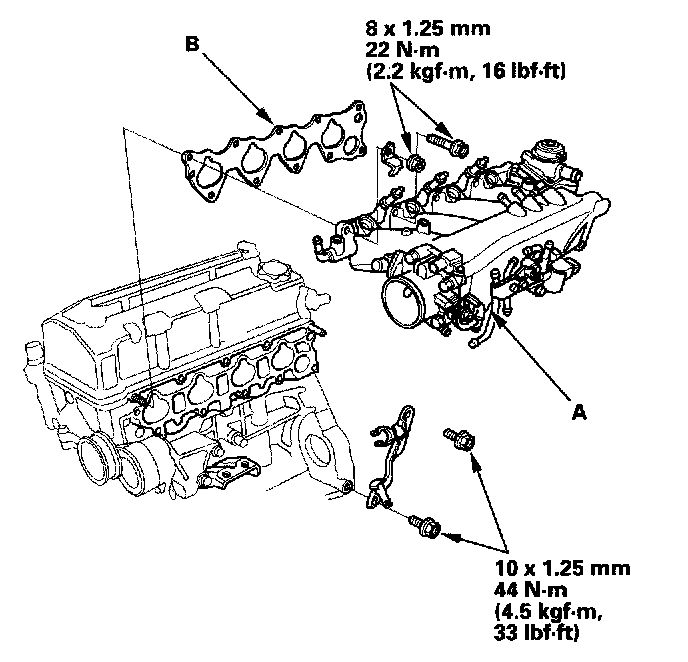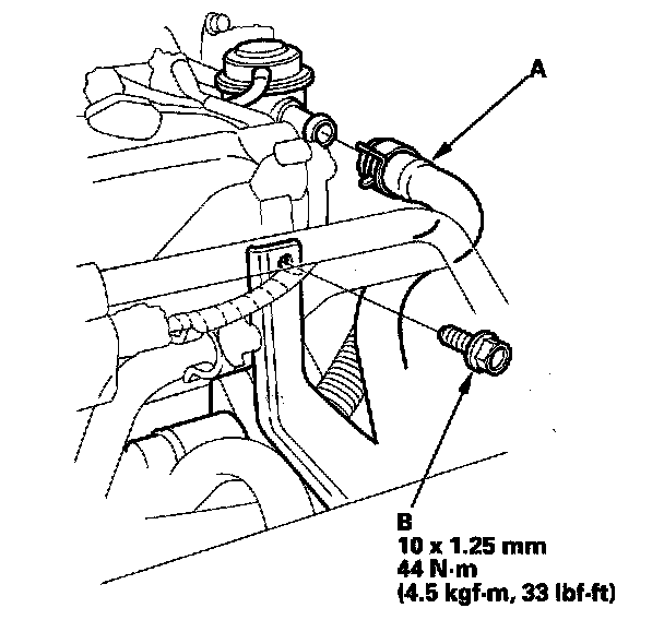 40. Install the air hose (A), and tighten the bolt (B) securing the intake manifold bracket.