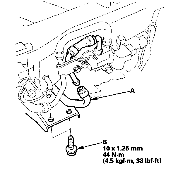 38. Install the water bypass hose (A), and tighten the two bolts (B) securing the intake manifold bracket.