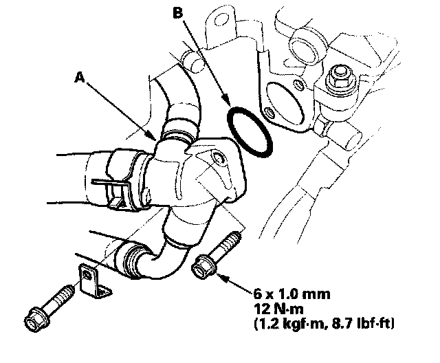 39. Install the water outlet cover (A) with a new O-ring (B).