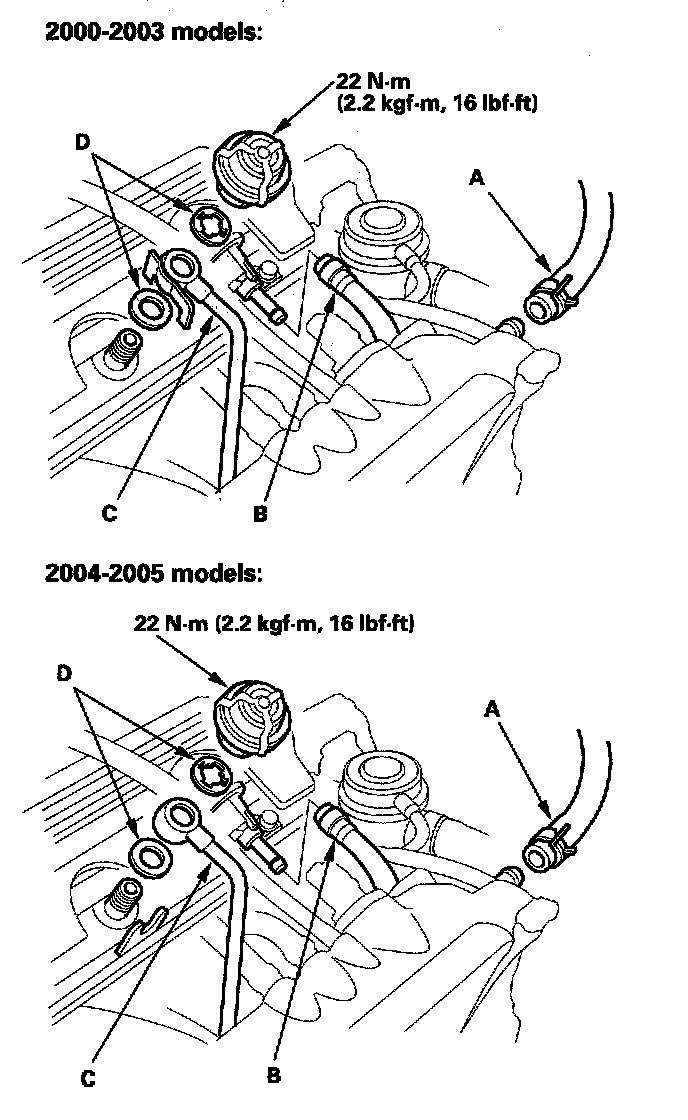 42. Install the brake booster vacuum hose (A), fuel return hose (B), and fuel feed hose (C), using new washers (D).