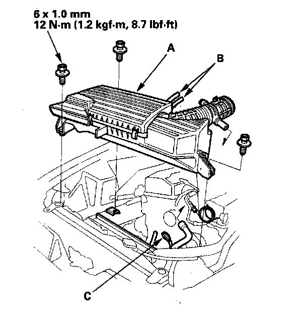 44. Install the air cleaner housing/intake air duct assembly (A), then install the vacuum hoses (B). Connect the air control solenoid valve connector (C).
