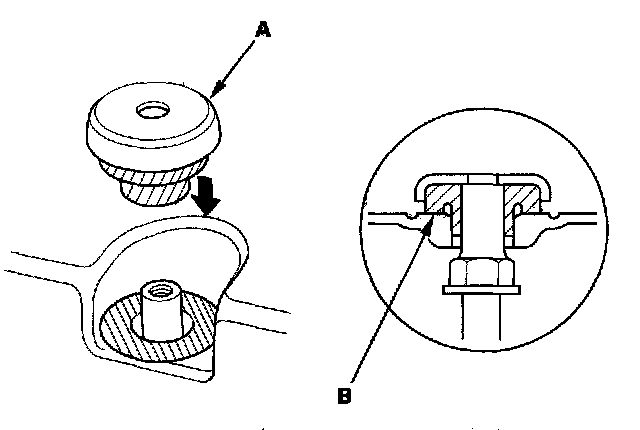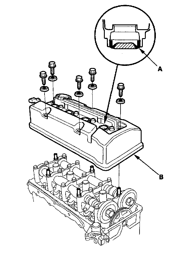6. Make sure the rubber seals (B) are securely seated on the cylinder head cover.