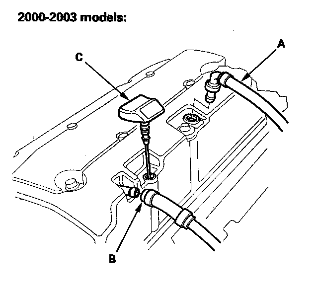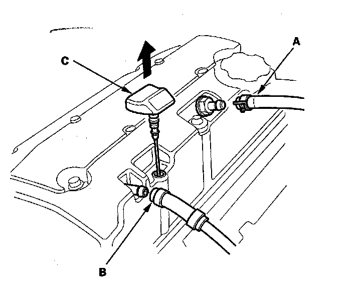 9. Install the positive crankcase ventilation (PCV) hose (A) and breather hose (B), then insert the dipstick (C).
