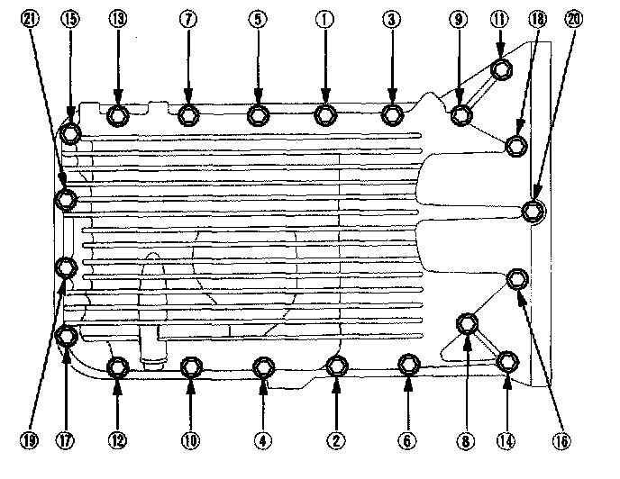Tighten the bolts in two or three steps. In the final step, tighten all bolts, in sequence, to 12 Nm (1.2 kgf-m, 8.7 ft. lbs.).