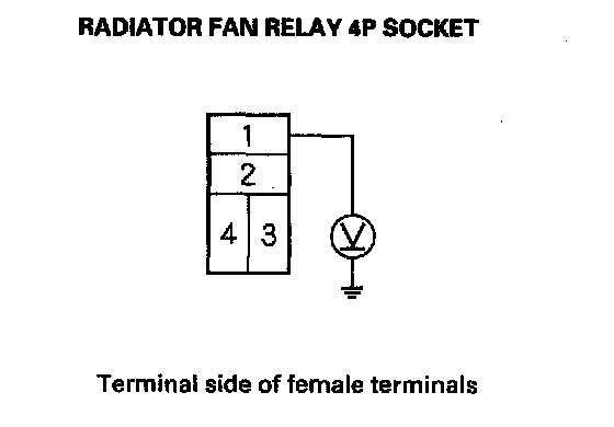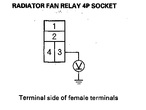 5. Disconnect the jumper, and turn the ignition switch ON (II). Check for voltage between the No. 3 terminal of the radiator fan relay 4P socket and body ground.