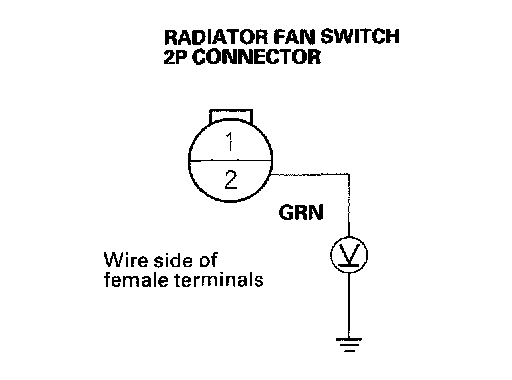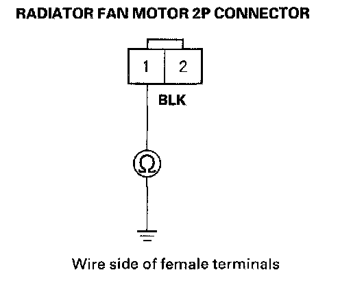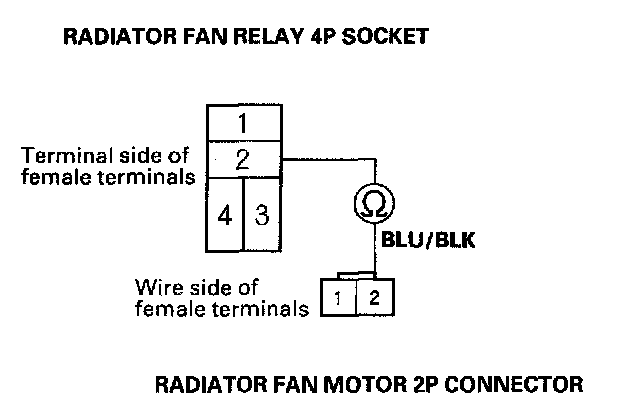 7. Check for continuity between the No. 2 terminal of the radiator fan relay 4P socket and the No. 2 terminal of the radiator fan motor 2P connector.