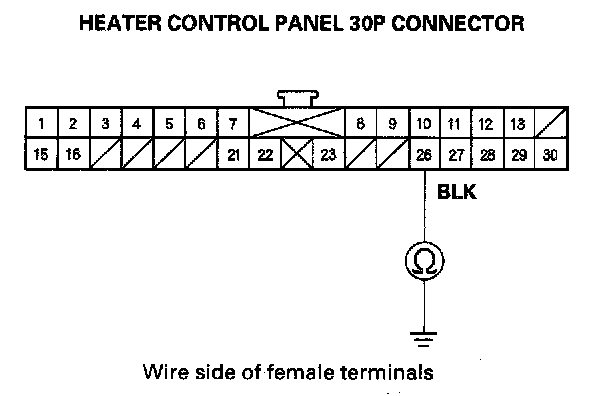 7. Check for continuity between the No.26 terminal of the heater control panel 30P connector and body ground.