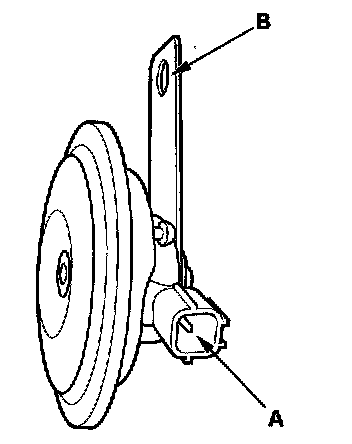 4. Test the horn by connecting battery power to the terminal (A) and grounding to the bracket (B). The horn should sound.