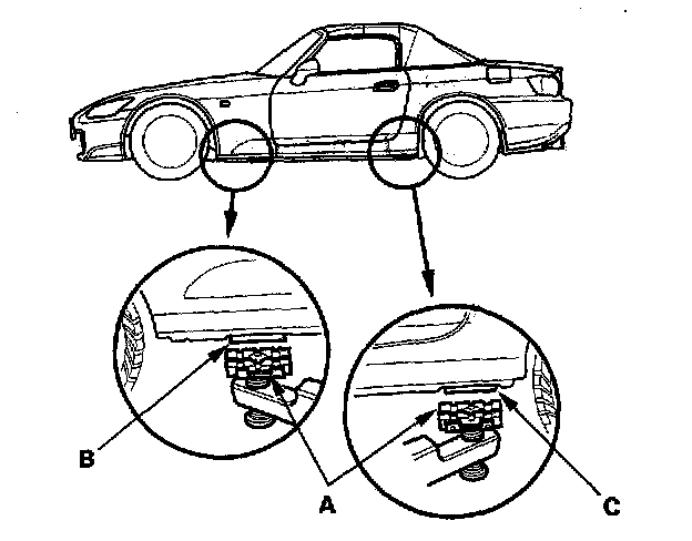 1. Position the hoist lift blocks (A), on safety stands, under the vehicle's front support points (B) and rear support points (C).