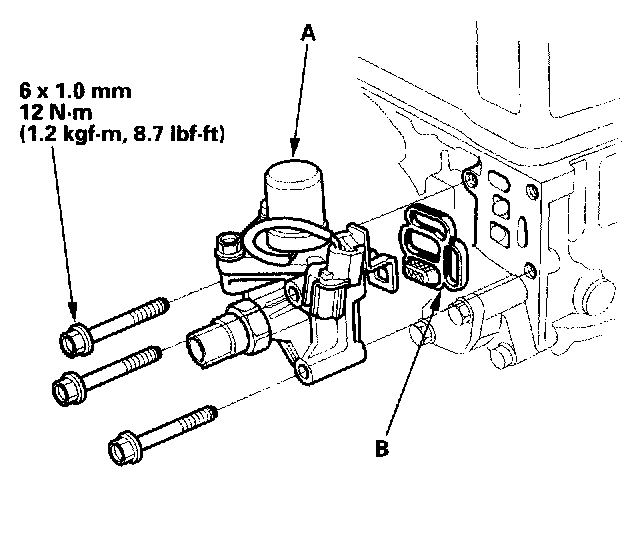 3. If the resistance is within specifications, remove the VTEC solenoid valve assembly (A) from the cylinder head, and check the VTEC solenoid valve filter (B) for clogging. If there is clogging, replace the engine oil filter, VTEC solenoid valve filter, and the engine oil.