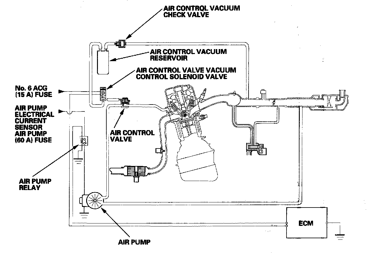 When the engine is cold and first started, the air pump pumps fresh air into the exhaust ports. The amount of air entering the exhaust is regulated by an air control valve which is controlled by the ECM. The system does not work for more than 60 seconds at a time. Actual operating time will very depending on the difference Between engine coolant temperature and intake air temperature.