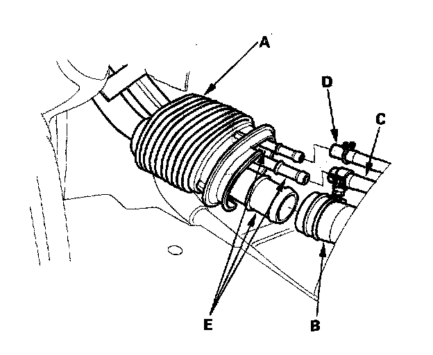 9. Remove the fuel pipe cover (A), and disconnect the fuel fill neck tube (B), the fuel tank vapor recirculation tube (C) and the fuel tank vapor signal tube (D) from the fuel fill pipes (E).