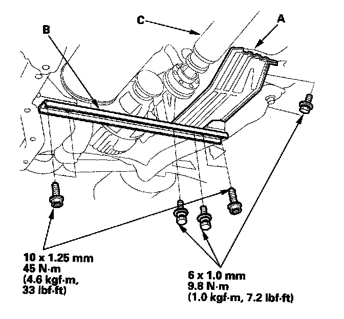 17. Remove the canister cover (A), rear suspension stiffener (B), and the propeller shaft (C).