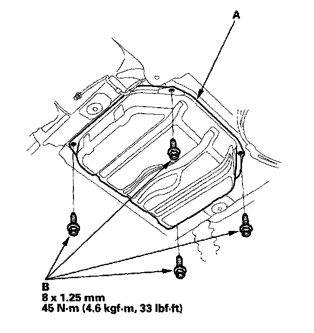 23. Place the jack or support under the fuel tank (A) and remove the mounting bolts (B) and the fuel tank.