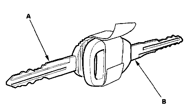 7. Tape the donor vehicle's ignition key head-to-head to the test vehicle's temporary key (A). The ECM will recognize the code from the donor vehicle's key (B) and allow you to start the engine with the temporary key.
