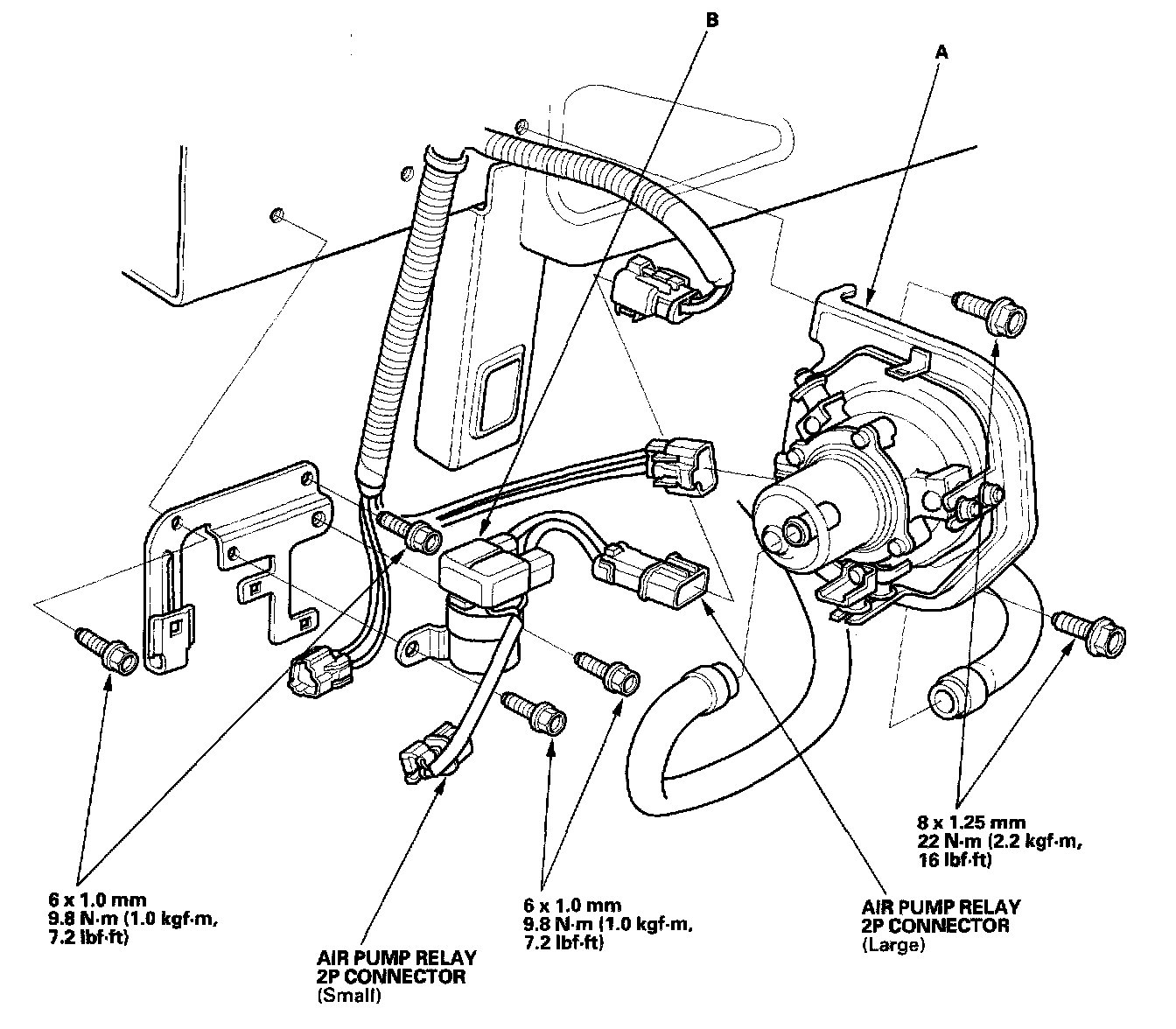 Remove the air pump (A), and the air pump relay (B).