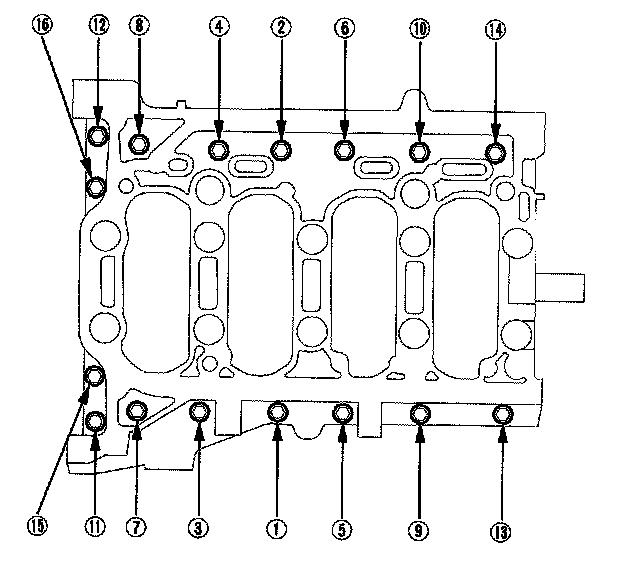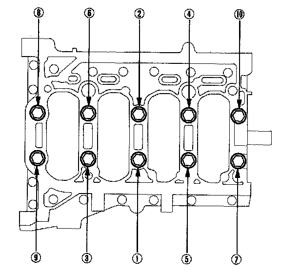 Tighten the bearing cap bolts is sequence to 29 Nm (30 kgf-m, 22 ft. lbs.)