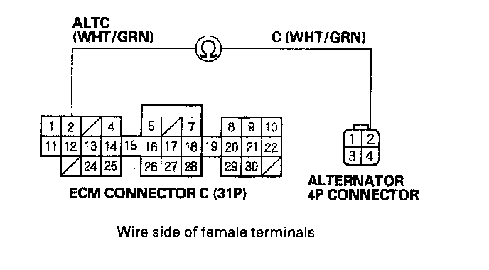 10. Check for continuity between the ECM connector C terminal No. 2 and alternator 4P connector terminal No. 2.