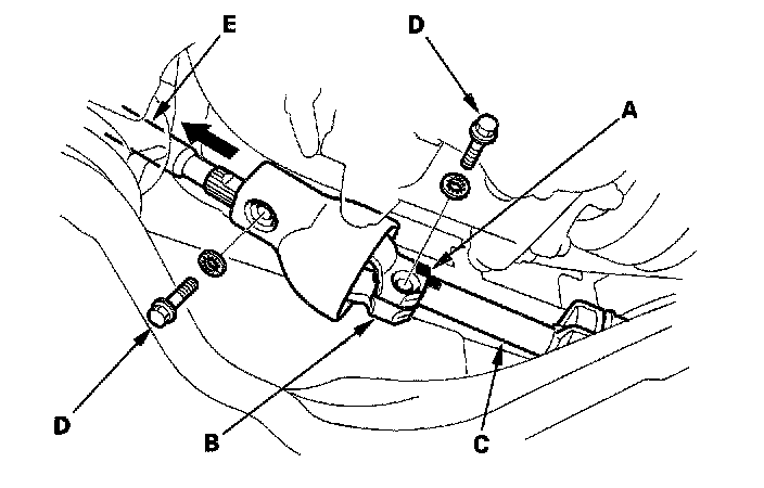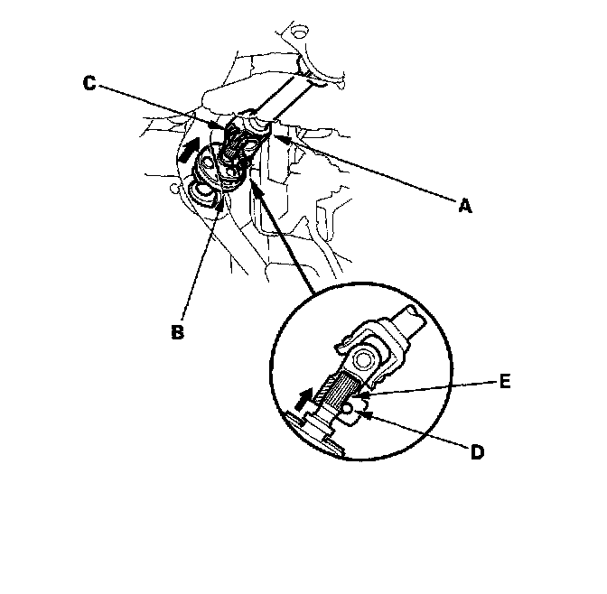 6. Line up the bolt hole (C) with the flat portion (D) of the shaft (B), and loosely install the upper joint bolt (E). Pull the steering joint to make sure that the joint is fully seated.