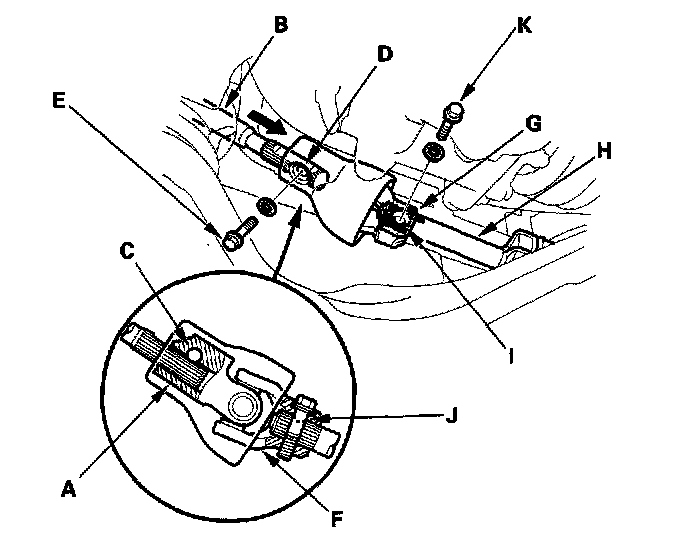 7. Slip on the lower end (F) of the steering joint by aligning the marks (G) on the pinion shaft (H) and joint. Line up the bolt hole (I) with groove around (J) the pinion shaft, and install the lower joint bolt (K) and tighten it by hand. Don't torque the bolt yet. Pull the steering joint to make sure that the joint is fully seated.