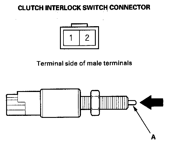 2. Check the clutch interlock switch connector terminals for continuity. There should be no continuity between the terminals with the button (A) released, and there should be continuity with the button pressed.